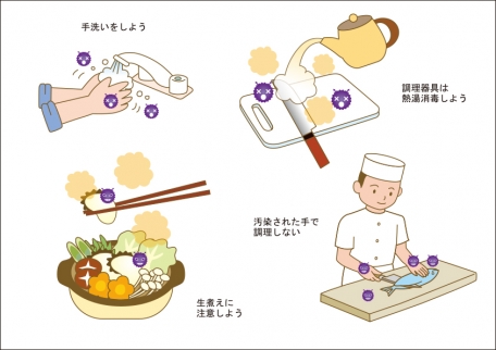 調理に携わる人は、普段から自分の体調に注意を払う必要があります。特に下痢や腹痛といった消化器症状がある場合は、ノロウイルスの感染を考え、調理を担当しないようにしましょう。また不顕性感染の場合もありますので、調理前の手洗いを徹底することや、まな板などの調理器具を熱湯で殺菌消毒を行う必要があります。